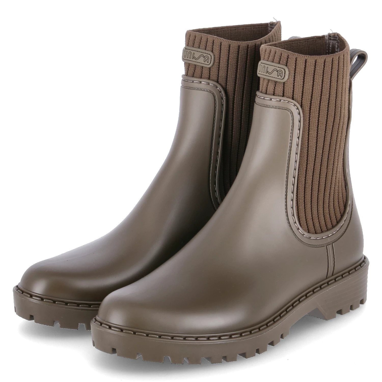 Unisa Damen Gummistiefel/ Chelsea Boots AYNAR Olive-GrĂĽn Textil-Synthetik-Mix – flexibler, gerippter Einstiegsstrumpf – Anziehlasche – flexible, rutschhemmende Profilsohle – gepolsterte und herausnehmbare Decksohle