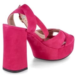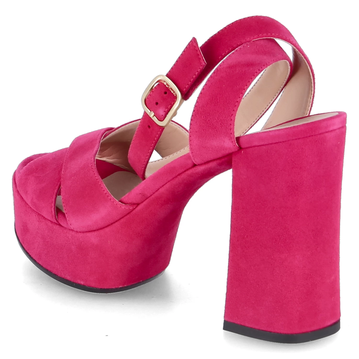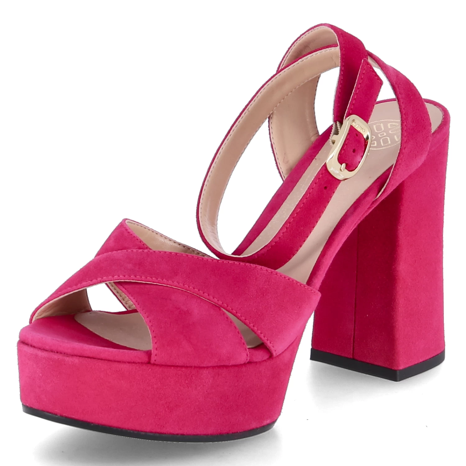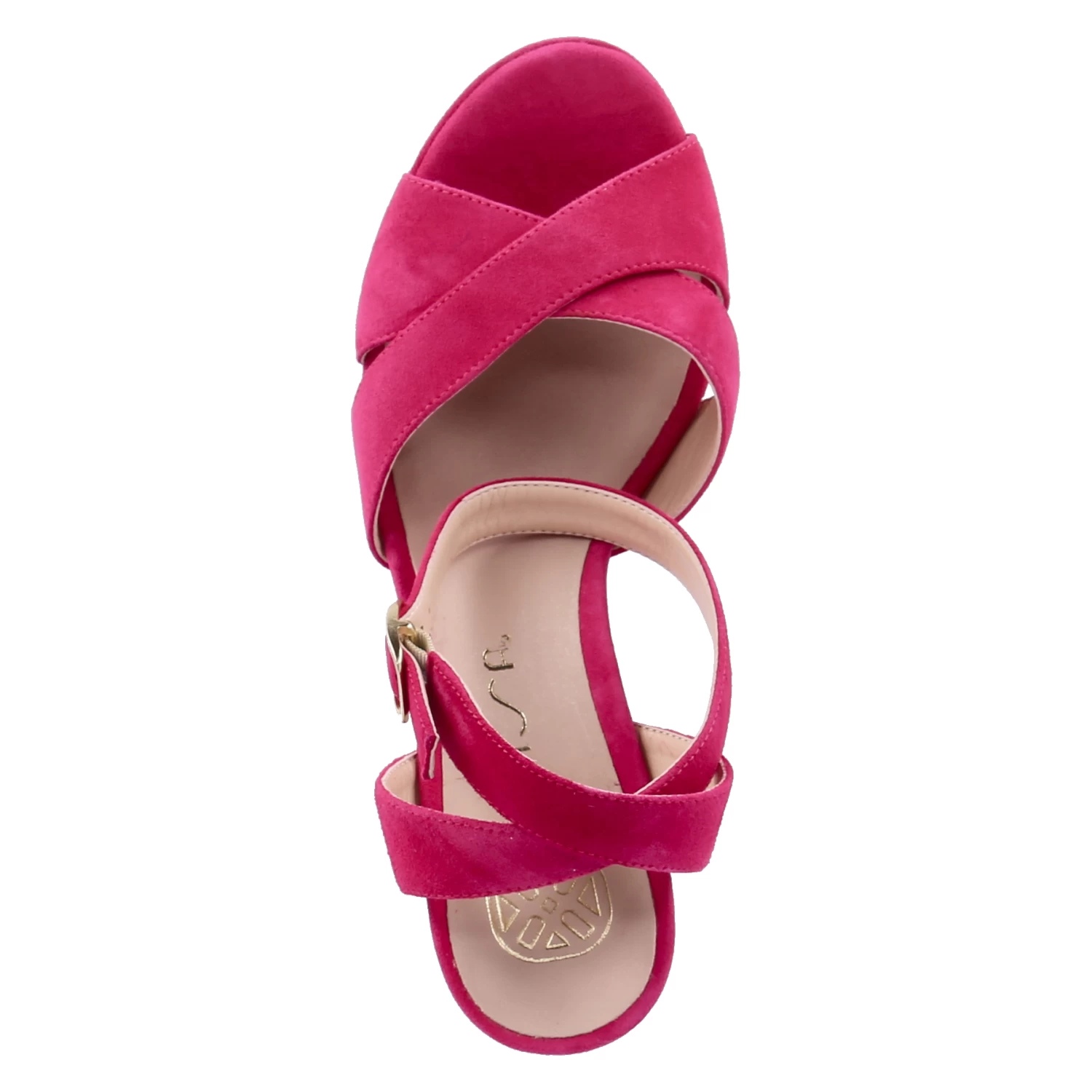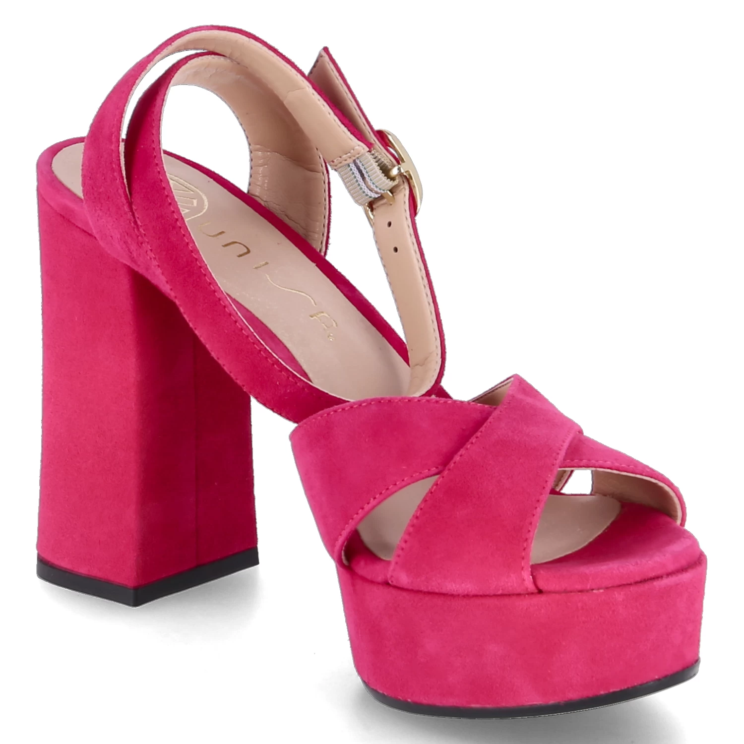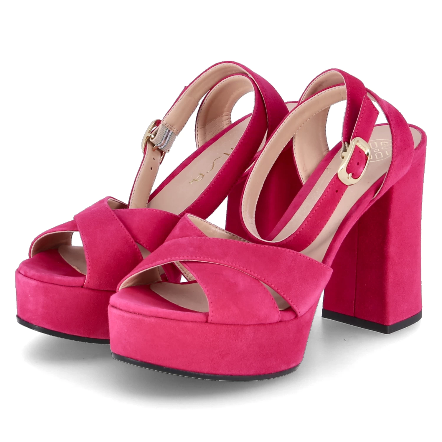 Unisa Damen Sandaletten/ Riemchensandalen VERNI Pink Rauleder – samtige Oberfläche – gekreuzte Riemen – Ankle Strap mit Schnalle und Elastikeinsatz – stabiler Blockabsatz von ca. 11cm und Plateau von ca. 3cm Höhe – rutschhemmende Laufsohle