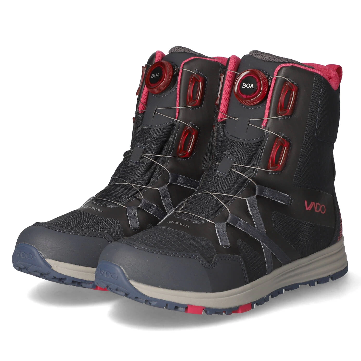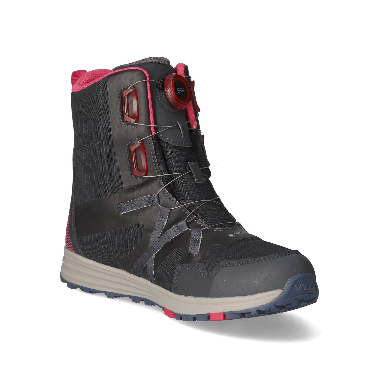 Vado Kinder Stiefeletten/ Winterstiefeletten MIKE Grau Textil-Synthetik-Mix – wasserfest und atmungsaktiv (GORE-TEX) – BOA-Drehverschluss – warmes Synthetik-Textilfutter – Anziehlasche – gepolsterter Einstieg – verstärkter Zehen- Fersenbereich – gepolstertes Wechseldecksohle – flexible, rutschhemmende Profilsohle