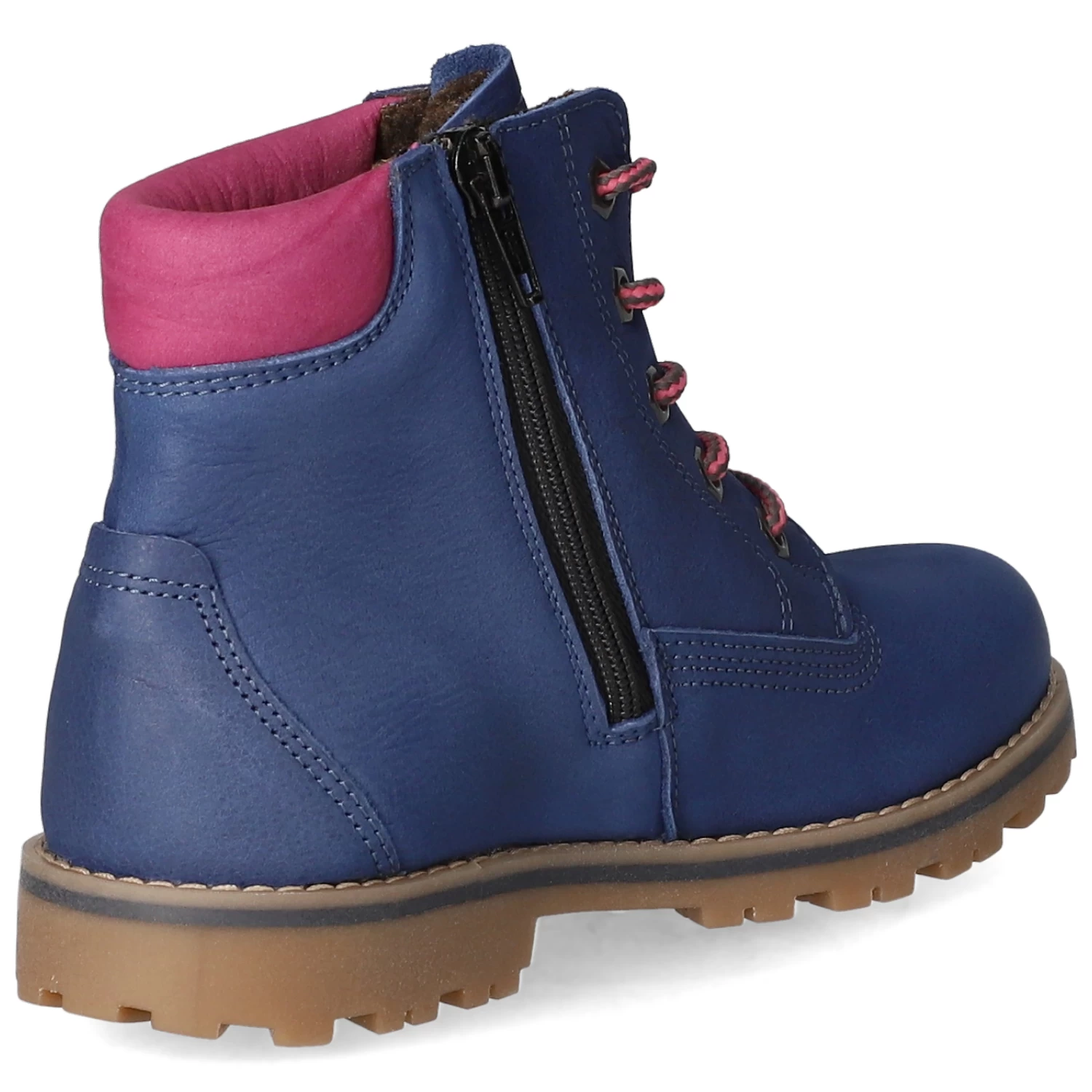 Vado Mädchen Stiefeletten MILAN Blau Rauleder – Ziernähte – ReiĂźverschluss und SchnĂĽrung – rosa Detail am Schaft – gepolsterter Einstieg – verstärkter Zehen- und Fersenbereich – WechselfuĂźbett – leichtes Futter fĂĽr kĂĽhlere Tage – flexible, rutschhemmende Laufsohle – VA-TEX (wasserfest, atmungsaktiv)
