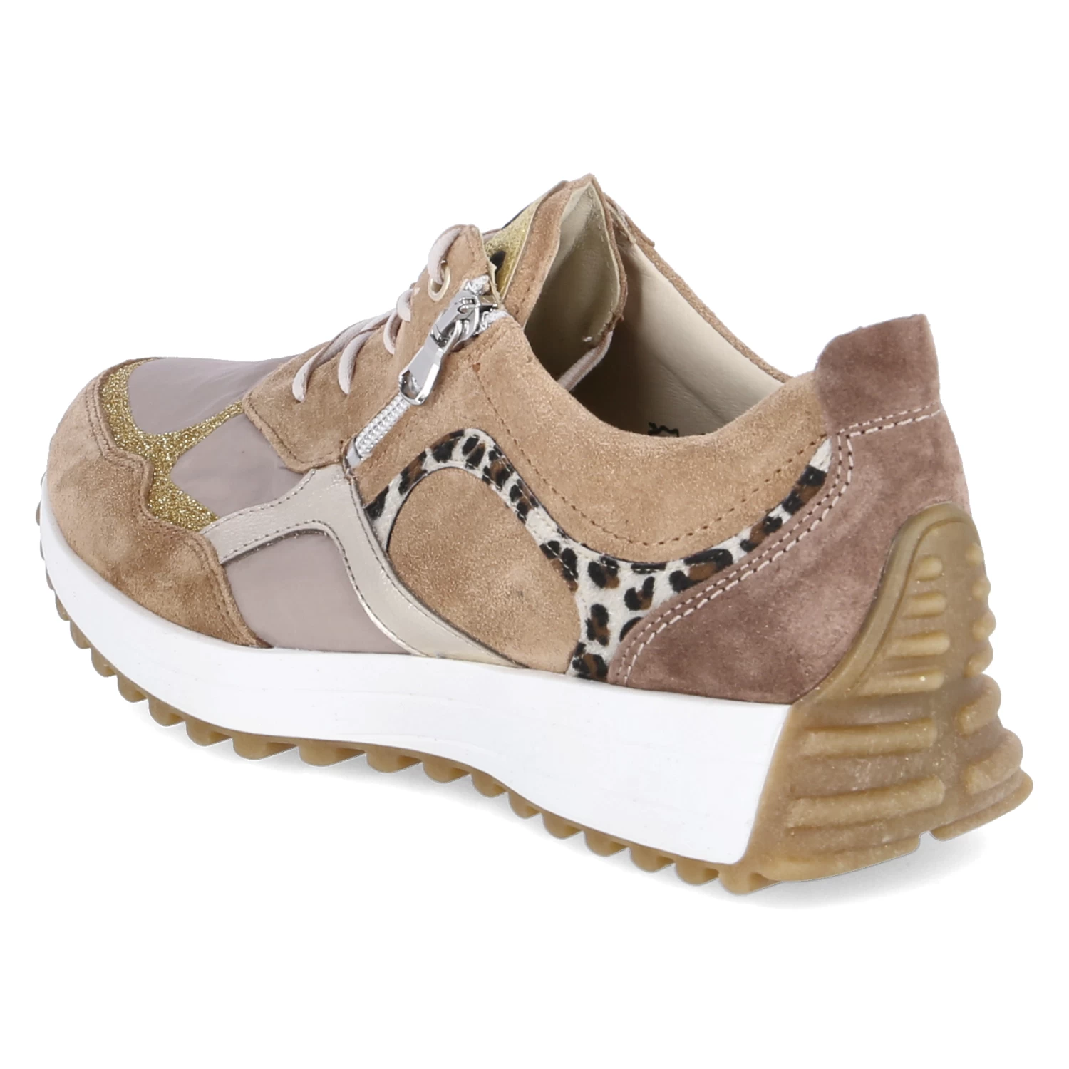 Waldläufer Damen Low Sneaker PINKY Braun Rauleder – sportliches Design – moderne Ziernähte – Animalprint (Leopard) – gold glitzernde Akzente – Schnürung und Reißverschluss – weiches Leder-Textilfutter – gepolsterte Wechseldecksohle – verstärkter Zehen- und Fersenbereich – flexible, rutschhemmende Profilsohle