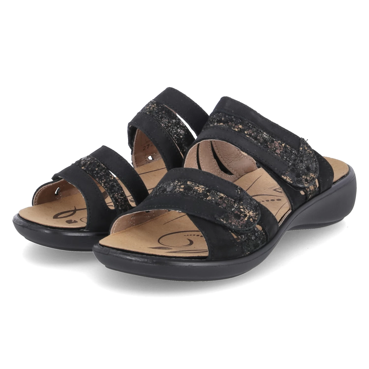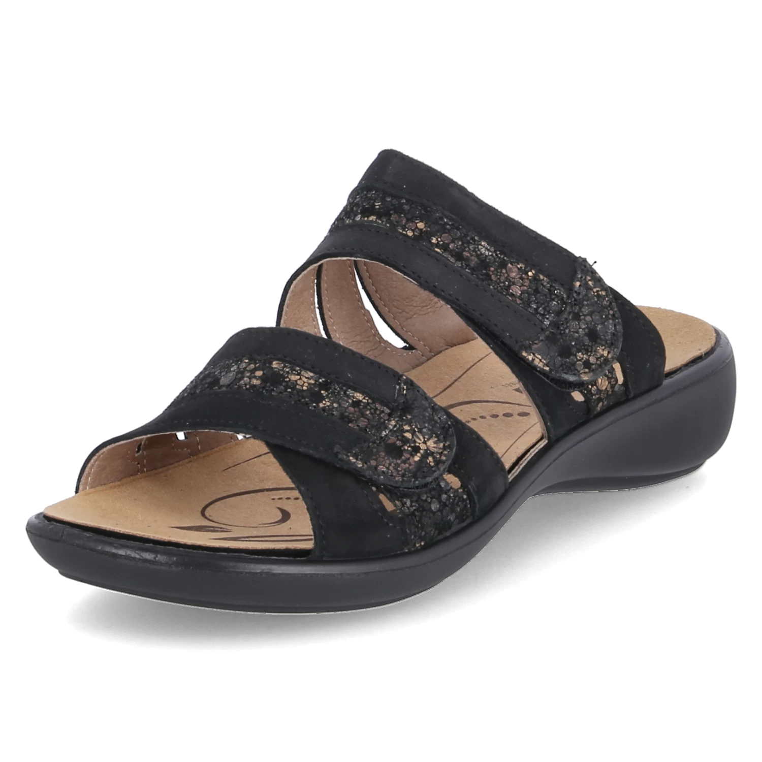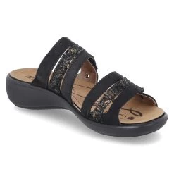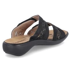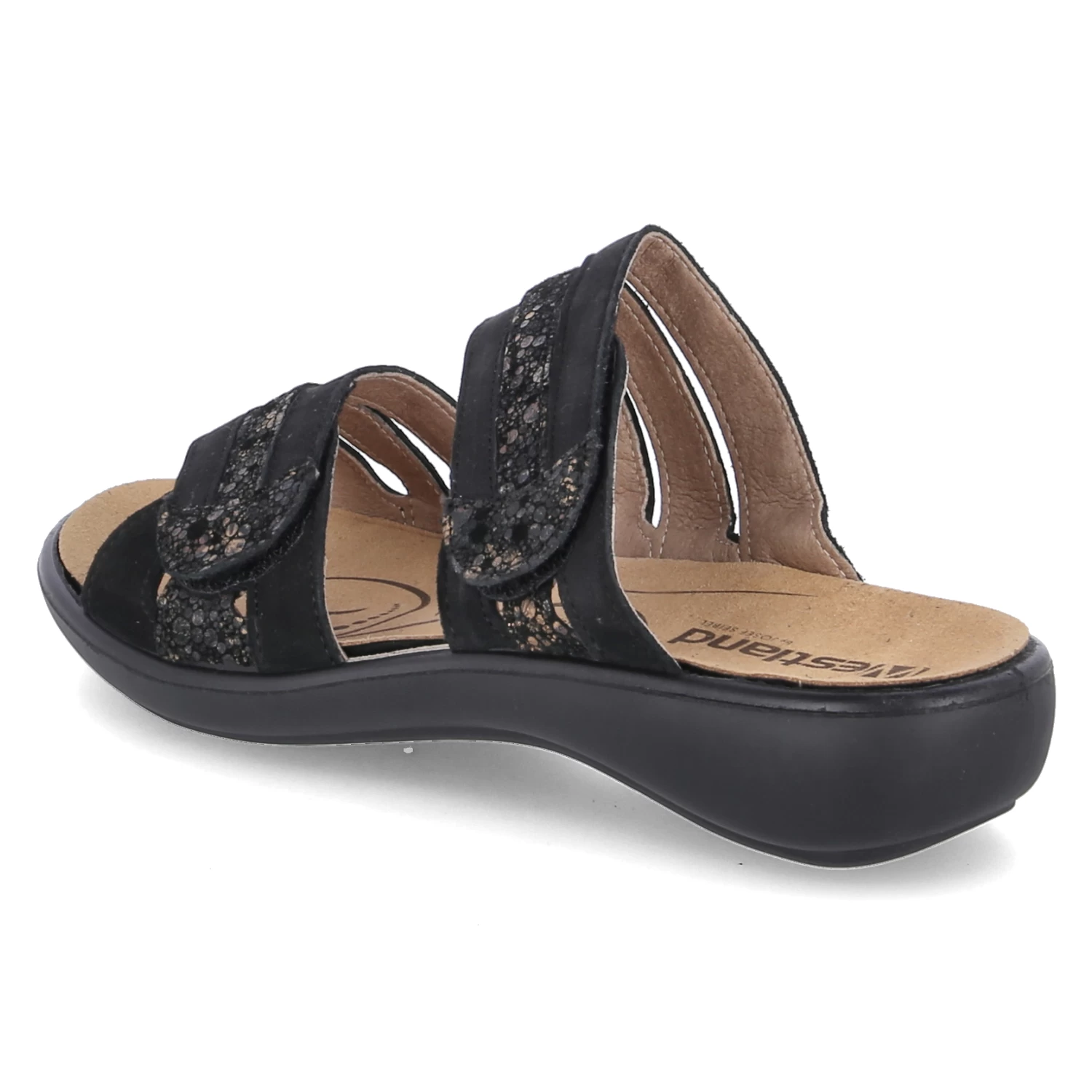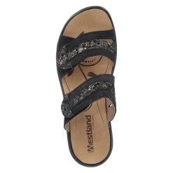 Westland Damen Pantoletten IBIZA 83 Schwarz Leder – zwei Klettriemen mit Zierelementen in Bronze – gepolstertes WechselfuĂźbett – flexible Laufsohle
